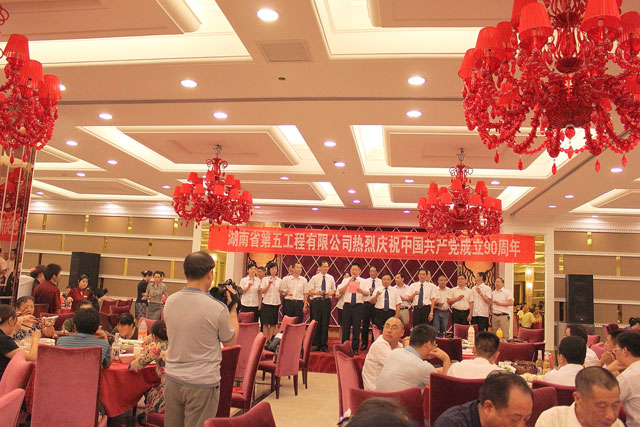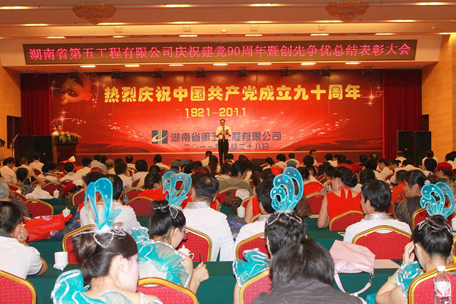是日下午的天臺山莊內(nèi),彩旗招展,氣球高懸,醒目的橫幅向大家展示:湖南省第五工程有限公司隆重慶祝中國共產(chǎn)黨成立90周年;沒有共產(chǎn)黨,就沒有新中國;團(tuán)結(jié)拼搏,以優(yōu)異成績向建黨90周年獻(xiàn)禮,充分表達(dá)了湖南五建人對黨的熱愛之情。