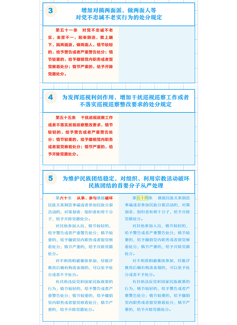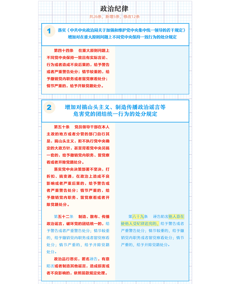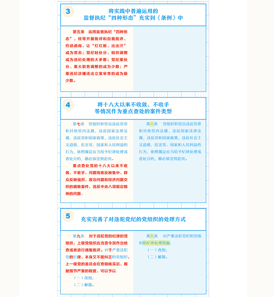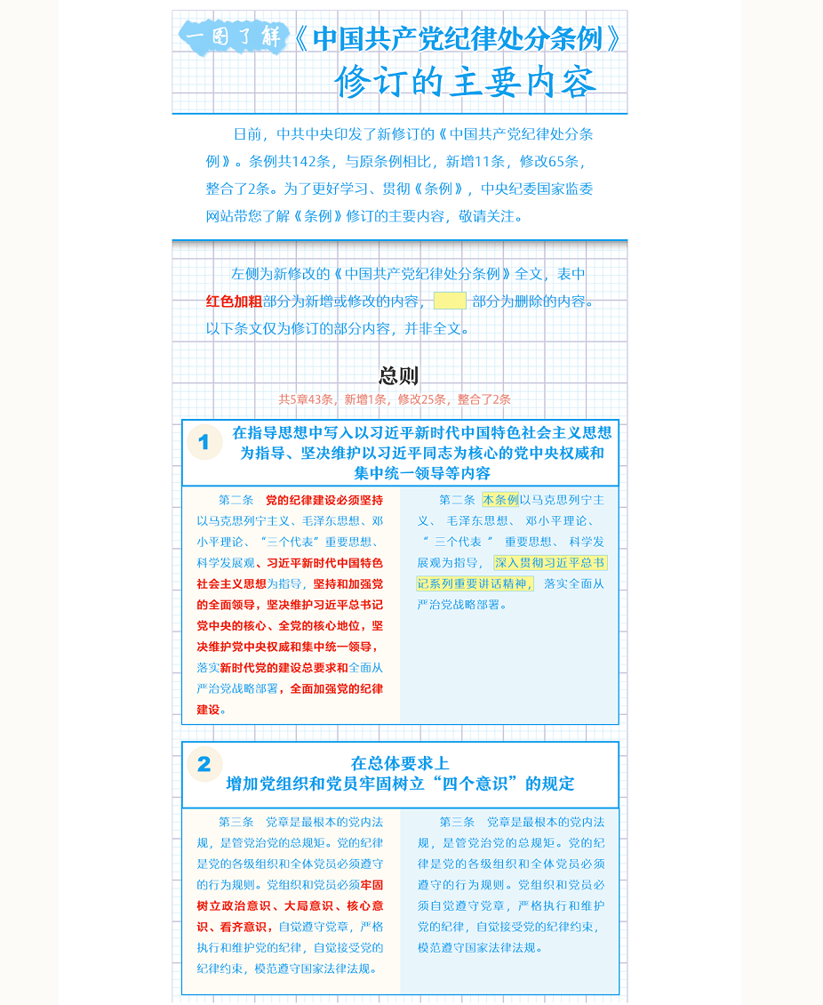 【編者按】近日,中共中央印發(fā)了修訂后的《中國共產(chǎn)黨紀(jì)律處分條例》(以下簡稱《條例》),并發(fā)出通知,要求各地區(qū)各部門認(rèn)真遵照執(zhí)行。本期推出《一圖了解〈中國共產(chǎn)黨紀(jì)律處分條例〉修訂的主要內(nèi)容》,公司各級黨組織要擔(dān)負(fù)起全面從嚴(yán)治黨政治責(zé)任,組織好《條例》的學(xué)習(xí)宣傳和貫徹落實(shí);各級紀(jì)檢組織要強(qiáng)化監(jiān)督執(zhí)紀(jì)問責(zé),讓制度“長牙”、紀(jì)律“帶電”,促進(jìn)公司全面從嚴(yán)治黨向縱深發(fā)展。