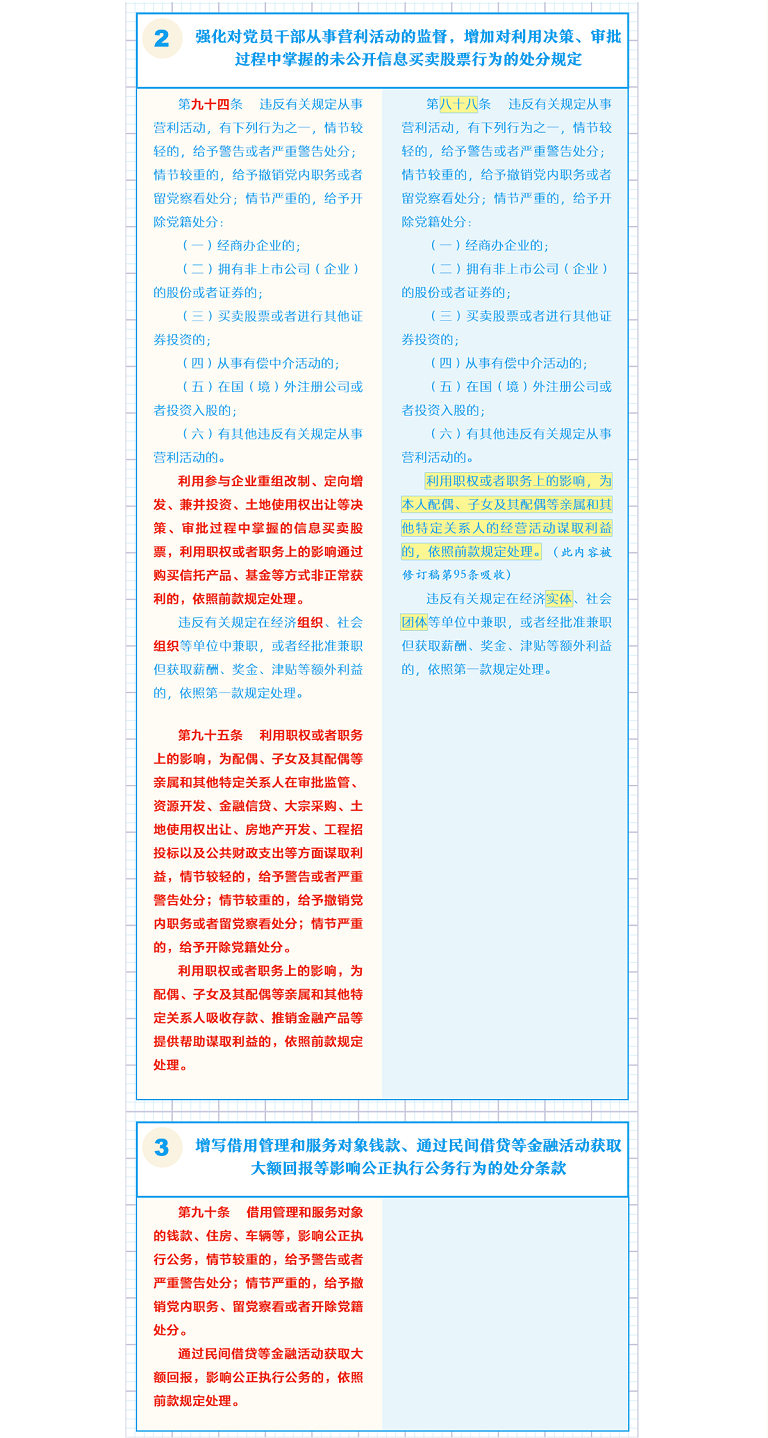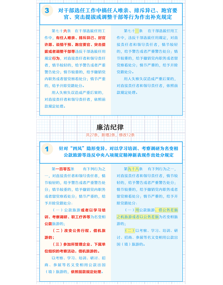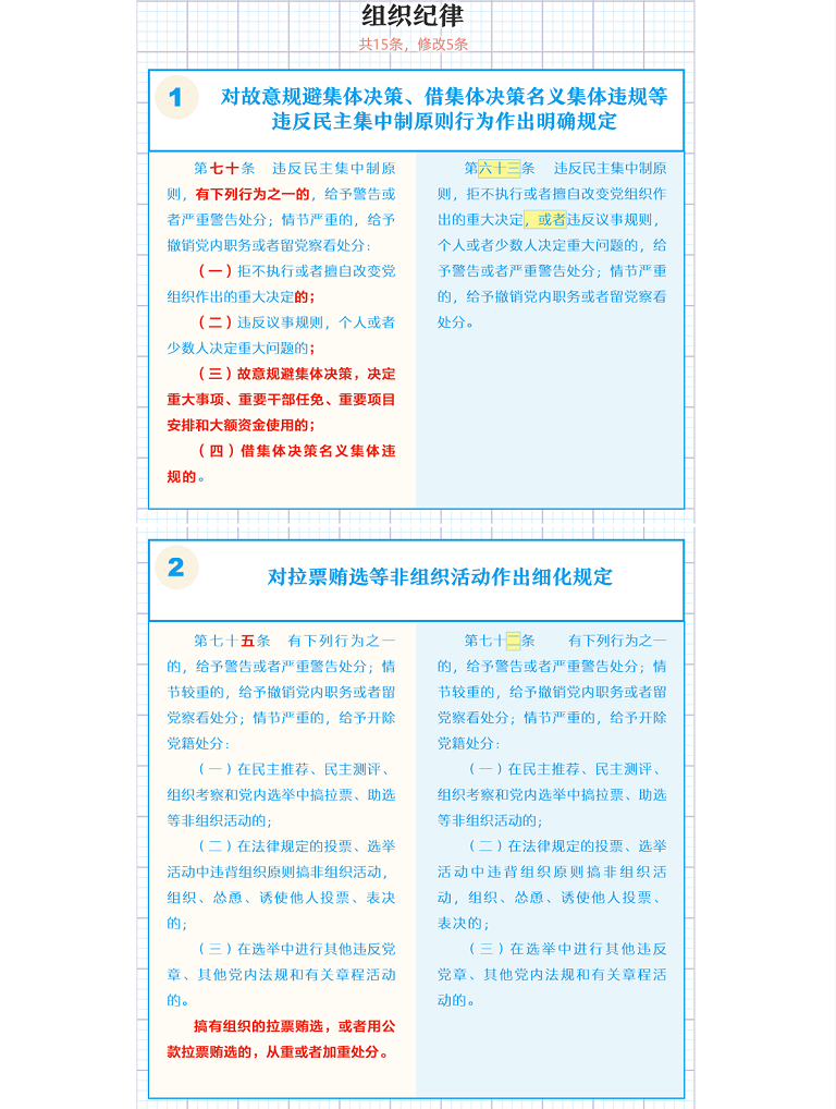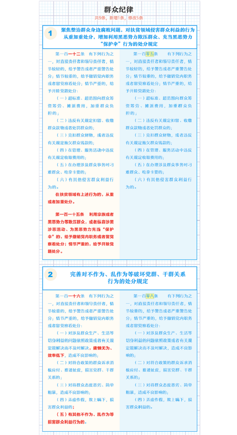 【編者按】近日,中共中央印發(fā)了修訂后的《中國共產(chǎn)黨紀(jì)律處分條例》(以下簡稱《條例》),并發(fā)出通知,要求各地區(qū)各部門認(rèn)真遵照執(zhí)行。本期推出《一圖了解〈中國共產(chǎn)黨紀(jì)律處分條例〉修訂的主要內(nèi)容》,公司各級黨組織要擔(dān)負(fù)起全面從嚴(yán)治黨政治責(zé)任,組織好《條例》的學(xué)習(xí)宣傳和貫徹落實(shí);各級紀(jì)檢組織要強(qiáng)化監(jiān)督執(zhí)紀(jì)問責(zé),讓制度“長牙”、紀(jì)律“帶電”,促進(jìn)公司全面從嚴(yán)治黨向縱深發(fā)展。