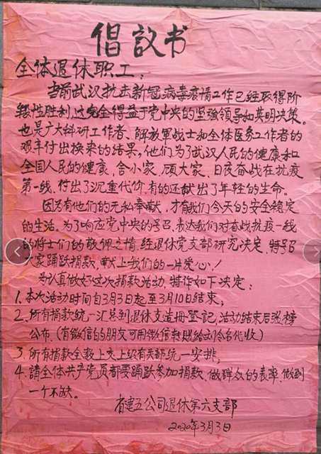 捐款雖不多,但表達(dá)了老同志的一片心意,更體現(xiàn)了黨員群眾凝心聚力抗疫情的堅定決心。捐款過程中,涌現(xiàn)出許許多多的感人事跡。岳陽分公司原黨委書記曾瑞龍同志雖在株洲已捐款,這次又向退休支部捐款500元。老黨員吳仁柏的愛人雖然患有淋巴癌需要錢治病,但他仍然捐款500元,他說:“我只是踐行一個黨員的初心使命”。退休職工鄧?yán)謿材杲?0歲,她第一個帶頭捐款1000元。更有生活區(qū)內(nèi)職工王明初、馬治國本身患尿毒癥,長期需要做血透、吃藥,也堅持一定要參加捐款盡自己微薄之力,表達(dá)一份心意。下崗職工向紅、李紹初同志的愛人含著眼淚說:“在電視上看見武漢抗疫一線的醫(yī)務(wù)工作者為了救治病人,冒著自己可能被感染的生命危險拼命的工作,每天工作十幾個小時,無怨無悔,是多么的可敬啊!我們今天能這樣安穩(wěn)的生活,是與白衣天使們的辛勤付出是分不開的,我們捐這點錢算得了什么?”。