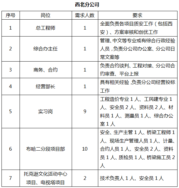2017年,公司在集團(tuán)的堅(jiān)強(qiáng)領(lǐng)導(dǎo)下,以“弘揚(yáng)工匠精神,打造百年老店”為戰(zhàn)略目標(biāo),堅(jiān)持“創(chuàng)新創(chuàng)優(yōu)創(chuàng)效”總要求,加強(qiáng)黨的建設(shè),推進(jìn)改革改制,加速經(jīng)營轉(zhuǎn)型,全面提升管理,奮力扶貧攻堅(jiān),取得了良好發(fā)展成績。全年承接施工任務(wù)逾200億元,并成功申報(bào)建筑工程施工總承包特級(jí)資質(zhì)。被列入“全國施工企業(yè)500強(qiáng)”、“中國建筑業(yè)競(jìng)爭(zhēng)力200強(qiáng)企業(yè)”、“中國建筑業(yè)成長性200強(qiáng)企業(yè)”,F(xiàn)根據(jù)公司實(shí)際情況,進(jìn)行西北、四川分公司及項(xiàng)目管理人員的選聘。具體要求如下: