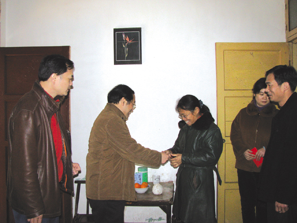 困難職工李志珍已離異數(shù)年,并負(fù)7級(jí)工傷,喪失了基本的勞動(dòng)能力,靠微薄的內(nèi)退工資和低保救濟(jì)金維持艱難的生活,還要獨(dú)自負(fù)擔(dān)正在讀大學(xué)的女兒的學(xué)費(fèi)等所有開(kāi)支,以致她這個(gè)單親家庭不堪重負(fù)。在她的家里,集團(tuán)副總經(jīng)理馮斌噓寒問(wèn)暖,為她送上500元的慰問(wèn)金,并勉勵(lì)她樹(shù)立戰(zhàn)勝困難的信心,培養(yǎng)好女兒。同時(shí),集團(tuán)不會(huì)忘記你們,有集團(tuán)的關(guān)心和發(fā)展,你們的生活一定會(huì)一天比一天幸福。