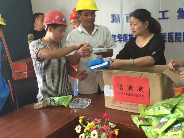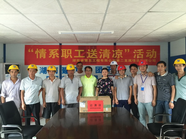 7月29日起,二直屬黨支部書記熊春江、副經(jīng)理李愛民一行從分公司出發(fā),先后奔赴株洲、湘鄉(xiāng)、永州、邵陽、益陽地區(qū)8個(gè)主體在建項(xiàng)目,把清涼物資(涼茶、清涼油、十滴水、人丹)等慰問物資送到了一線工人手中,同時(shí)也把公司的關(guān)心關(guān)懷送到工人的心坎。