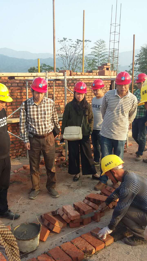 (圖為在板江安置點(diǎn)現(xiàn)場(chǎng)檢查工人砌筑質(zhì)量)