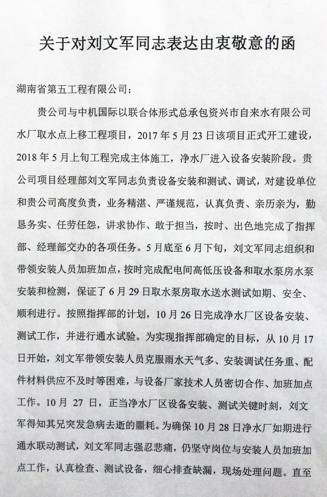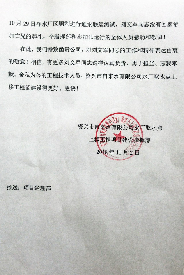 11月5日,公司收到資興市自來水有限公司水廠取水點上移工程項目建設指揮部《關于對劉文軍同志表達由衷敬意的函》,字里行間句句充滿對五建的信任和肯定,充滿對五建人工作認真負責的佩服和由衷的感謝。
