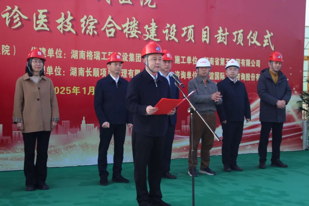2025年1月6日,湖南省人民醫(yī)院馬王堆院區(qū)住院門診醫(yī)技綜合樓建設項目迎來了主體結(jié)構(gòu)順利封頂。湖南省衛(wèi)生健康委黨組成員、副主任劉平安,委規(guī)劃發(fā)展和信息化處處長倪友平,湖南省人民醫(yī)院黨委書記趙衛(wèi)華,公司黨委書記、董事長林堅等出席封頂儀式,湖南省人民醫(yī)院院長肖亞洲主持封頂儀式。