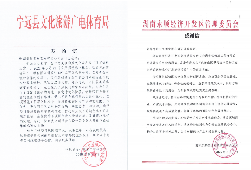 近日,湖南建投五建設(shè)計分公司憑借在“寧遠縣文化館、圖書館及非物質(zhì)文化遺產(chǎn)館(三館)建設(shè)項目EPC”與“武陵山區(qū)現(xiàn)代農(nóng)產(chǎn)品加工出口示范區(qū)標準化廠房建設(shè)項目”中的卓越表現(xiàn),分別榮獲寧遠縣文化旅游廣電體育局及湖南永順經(jīng)濟開發(fā)區(qū)管理委員會的感謝信。展現(xiàn)了對設(shè)計分公司專業(yè)實力與優(yōu)質(zhì)服務(wù)的高度認可。