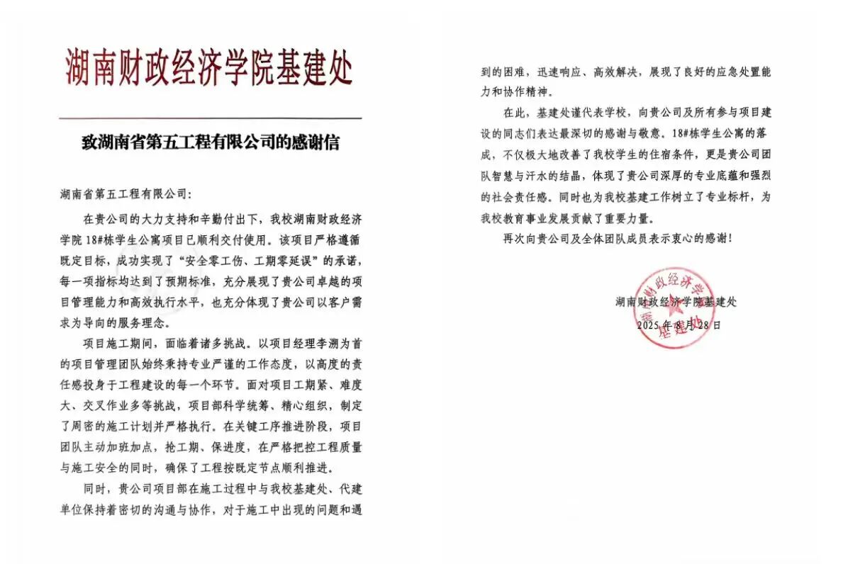 近日,湖南財政經(jīng)濟學院18#棟學生公寓項目順利交付,并且獲得了校方的高度認可與誠摯感謝。校方特致感謝信,對我司在項目建設中所展現(xiàn)的專業(yè)能力、高度負責的態(tài)度與卓越的協(xié)作精神予以充分肯定。