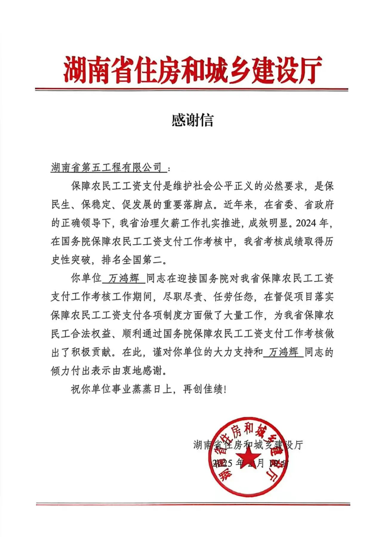 近日,湖南省住房和城鄉(xiāng)建設廳發(fā)來感謝信,對公司在國務院保障農民工工資支付工作考核迎檢中的大力支持,以及公司湘南分公司員工萬鴻輝在此期間的傾力付出,表示由衷感謝。