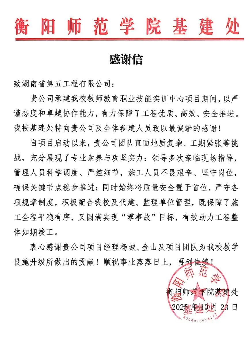 近日,由湘南分公司承建的衡陽師范學院教師教育實訓中心項目順利完成施工任務,贏得校方的高度認可與誠摯感謝。項目的按期完工既彰顯了公司在工程建設領域的硬核實力,更以實際行動推進“實干擔當 賦能發(fā)展”專項行動落地見效。